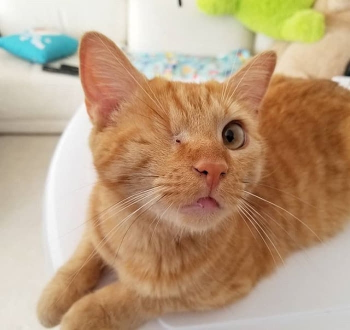 2살 정도 된 '바스티온(Bastion)'이라는 이름의 고양이는 다른 고양이들과 다르게 한쪽 눈이 없습니다. 하지만 다른 고양이들과 조금 다르긴 하지만 영락없이 사랑스럽고 귀여운 누군가의 가족이라는 사실은 틀림이 없죠. 바스티온은 2017년 10월 지금의 집사에게 입양된 후 다른 가정의 반려동물처럼 듬뿍 사랑을 받고 자라고 있습니다.