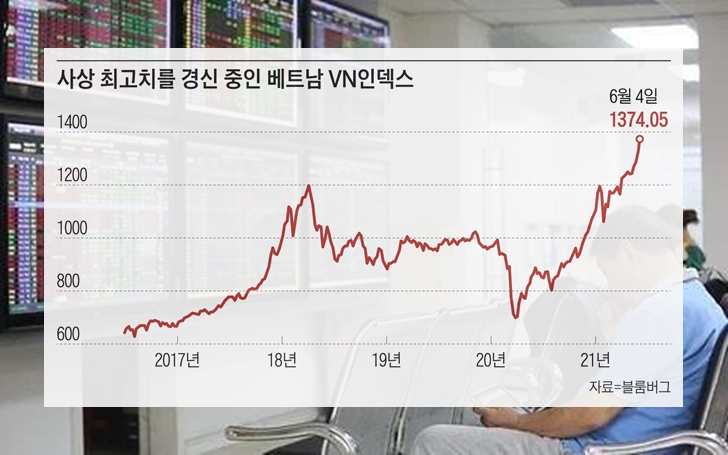 베트남 증시가 연인 새로운 기록을 갈아치우고 있습니다. 지난달 28일부터 꾸준히 상승세를 보이고 있는 베트남 펀드는 올 들어서만 20% 넘게 상승을 했죠. 여기에 중소형주 위주 하노이 증권거래소의 HNX지수는 이 기간 50% 이상 폭등을 해 유례없는 활황에 거래소 시스템에 과부하가 걸려 거래가 중단되는 사태까지도 발생되었습니다.