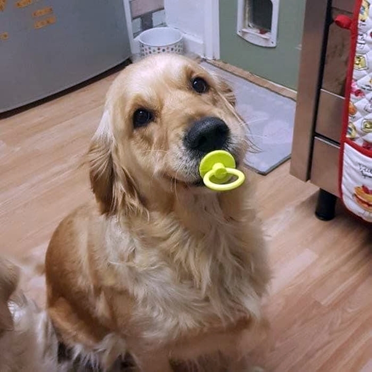 하지만 오늘 소개해 드릴 리트리버의 사연을 보시면 이런 장난감을 꼭 신생아만 사용하는 게 아니라는 생각이 드실 건데요. 해외 온라인 커뮤니티 '레딧(reddit)'에는 마치 어린아이처럼 공갈젖꼭지를 물고 마냥 행복한 웃음을 짓고 있는 리트리버의 사진이 공개돼 화제가 되었습니다.