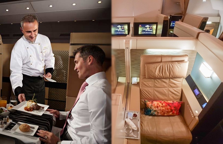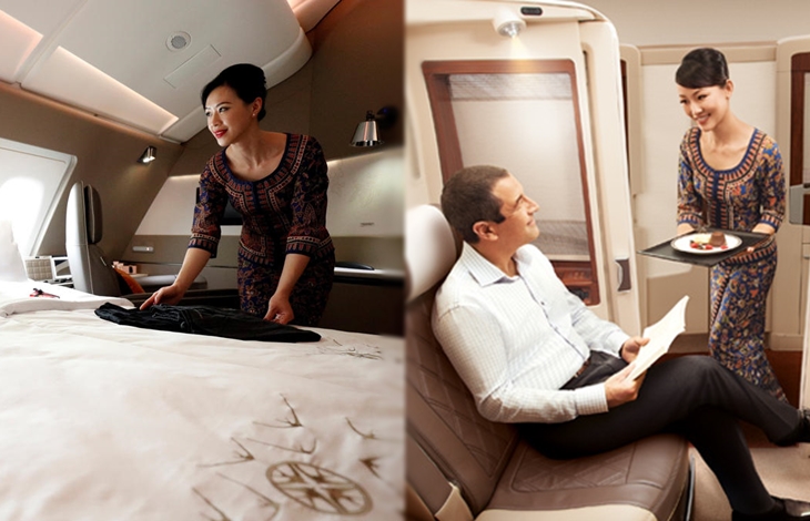 싱가포르 항공의 퍼스트 클래스 좌석은 일단 이탈리아 명품 '폴트로나 프라우(Poltrona Frau)'가 만든 가죽 가구들로 장식된 럭셔리한 1인실이 제공이 되고 있습니다. 개인실에는 32인치 TV는 물론이고 고급 화장품이 수납되어 있는 파우더룸 등이 갖쳐있죠. 여기에 명품 브랜드 '페라가모(Ferragamo)'의 향수와 립밤, 애프터 쉐이브, 물수건 등이 포함된 어매 니트와 함께 장시간 비행 중 편안한 잠자리를 위해 잠옷과 양말까지도 이용할 수 있습니다. 또 랍스터, 푸아그라 등이 포함된 고급 기내식 메뉴와 함께 2004년 산 최고급 돔 페리뇽 삼페인도 제공이 됩니다.