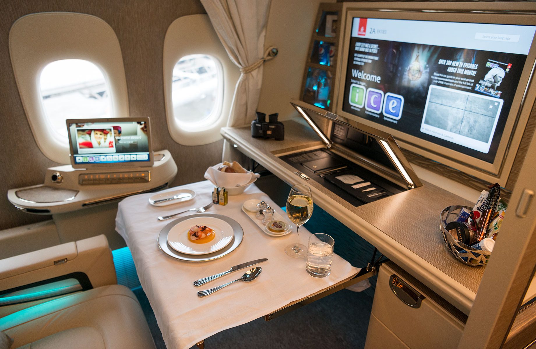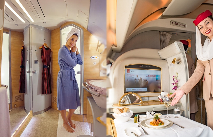 에미레이트 항공의 퍼스트 클래스는 외부로부터 공간을 차단할 수 있는 슬라이드 도어가 설치되어 있으며 내부에는 개인 미니바, 조명, 거울 등이 비치되어 있습니다. 또 원한다면 언제든지 승무원이 잠자리를 준비해주기 때문에 침대로 변신하는 의자에서 편하게 잠을 청할 수 있습니다. 어메니티로는 명품 브랜드 불가리와 바이레도 제품으로 구성된 칫솔, 로션, 티슈, 향수 등이 제공이 되죠. 기내식은 정해진 시간 없이 언제든지 원하면 최상급 와인과 기내식을 맛볼 수 있습니다.