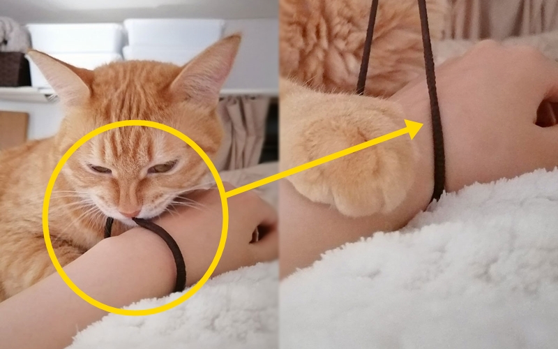 아침에 눈을 뜬 집사의 눈에 처음 들어온 건 너무나도 사랑스러운 반려묘 '치요 짱'이었습니다. 치요 짱은 네티즌의 팔에 앉아 무엇인가 유심히 바라보고 있었다고 하죠. 치요 짱이 바라본 건 다름 아닌 네티즌의 팔목에 있던 헤어 고무줄이었습니다.