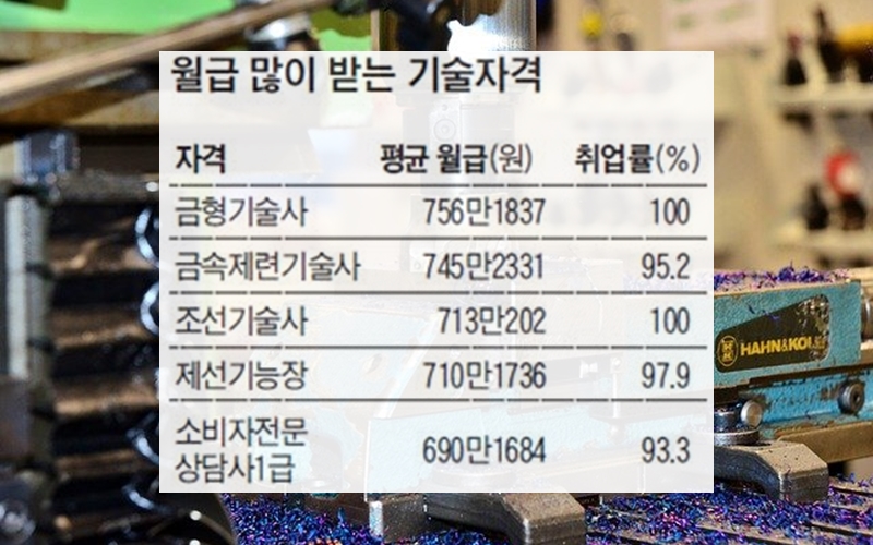 2014년 고용노동부 기준 금형기술사는 국가기술자격증 소지자 가운데 월평균 756만 1837원으로 월평균 소득 1위를 차지하였으며, 취업률 100%를 기록하였습니다. 금형기술사는 제조업의 근간이라고 할 수 있는 '금형'의 틀을 설계하고 제조하는 기술자로 반도체, 철도, 선박, 자동차, 항공, 산업기계, 정밀기계 등 다양한 제조품의 외형과 내부 구조의 틀을 짜는 하는 일이죠. 고용노동부 자료에 의하면 금형기술사의 고용유지율은 100%로, 대기업 종사 비율도 87%에 달 할 정도로 꿈의 자격증이라고 할 수 있습니다.