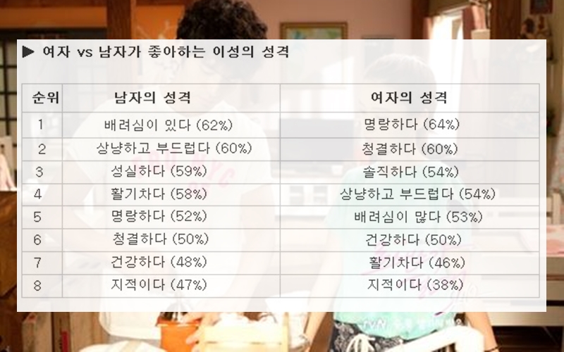 여성들의 경우 함께 감정을 나누고 소통이 가능한 자상하고 배려심 많은 성격을 좋아한다는 점에서 사치를 하거나 감정적이며 침울한 성격에 대해서는 반감을 갖고 있는 것으로 조사가 되었습니다. 또 남성들의 경우에는 침울하고 퇴폐적이고 유혹에 약한 성격을 싫어하는 것으로 나타났습니다.