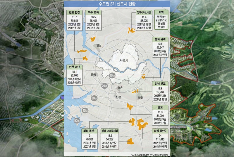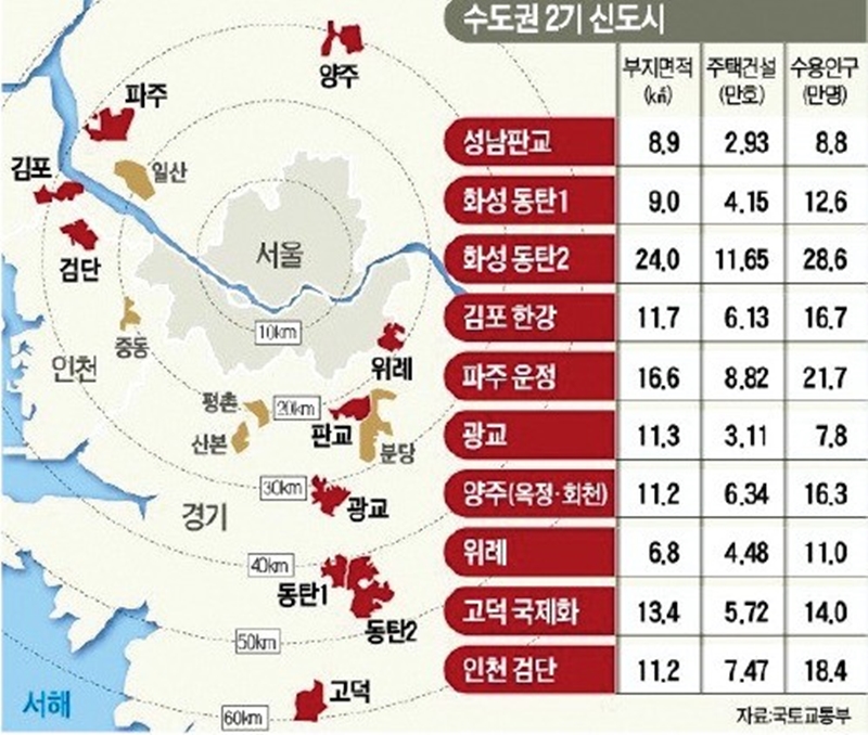 2003년 참여정부 시절 당시 서울 집값이 급등하는 것을 막기 위해 정부는 2시 신도시 조성 계획을 발표하였습니다. 경기도 화성시 동탄과 더불어 경기 김포(한강), 인천 검단, 평택 고덕, 수원 광교, 성남 판교, 서울 송파(위례), 양주 회천/옥정, 파주 운정 등을 포함해 총 12개의 지역이 2기 신도시로 지정이 되었죠. 1기 신도시인 분당 및 일산의 경우 서울 도심 반경 20km에 위치해 서울의 접근성이 좋았던 것과 반대로 2기 신도의 경우 서울 반경에서 30km 이상 떨어져 교통 접근성은 떨어진다는 단점이 당시에도 지적이 되었습니다.