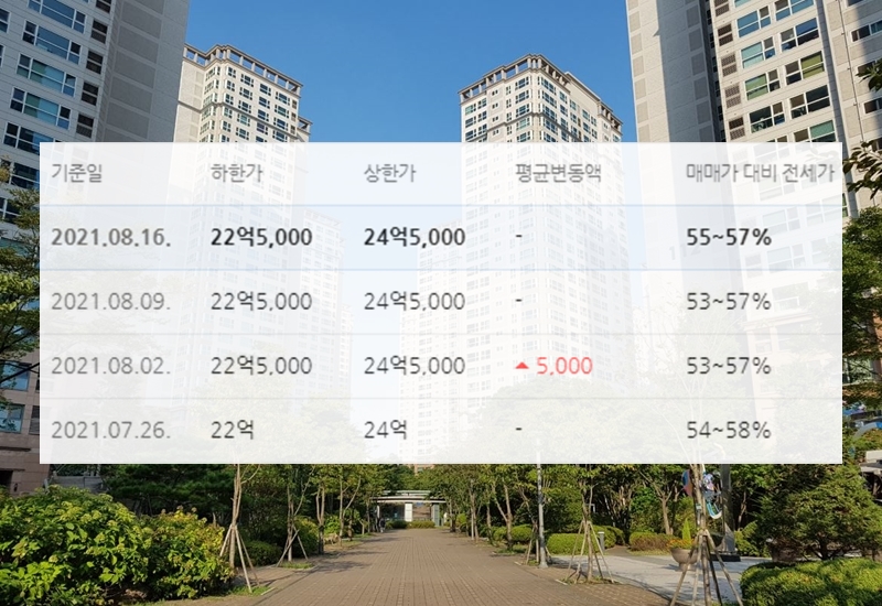 여기에 아파트 전셋값도 같은 기간 동안 2억 원 가까이 상승을 하였습니다. 연도별로 5월 기준 아파트 매매 가격을 살펴보면 2017년 6억 635만 원, 2018년 7억 5144만 원, 2019년 8억 2926만 원, 2020년 9억 2013 만원, 2021년 9억 9833만 원이 매매 가격이 올랐으며, 전셋값의 경우 같은 기간 2017년 4억 807만 원, 2018년 4억 2785만 원, 2019년 4억 3048만 원, 2020년 4억 5447만 원, 2021년 6억 696만 원이 오른 걸 확인할 수 있습니다.
