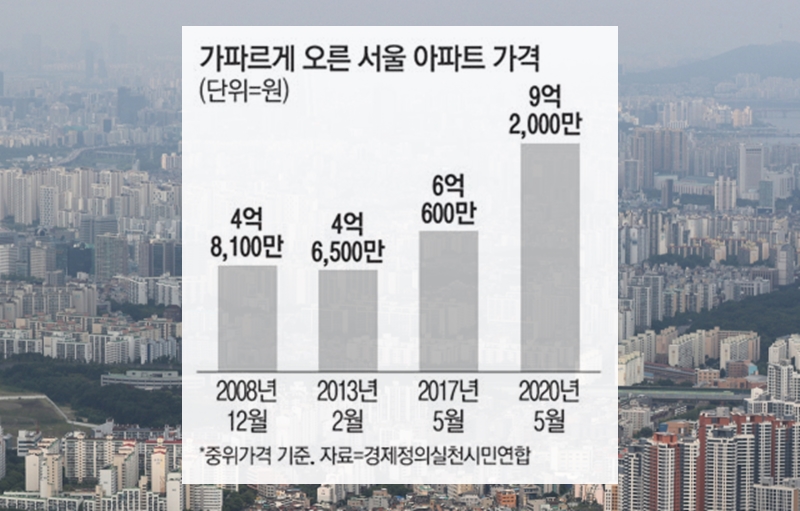 지난 2017년 서민들의 주거 안정을 위해 정부에서는 온갖 부동산 규제와 정책들을 쏟아냈지만 부동산 규제는 또 다른 풍선효과를 불러일으키면서 아파트 가격을 더 올리는데 부채질을 하는 꼴을 만들었습니다. KB 부동산의 주택 가격동향에 의하면 지난 2017년 5월 서울 아파트 중위 가격은 6억 635만 원 수준이었지만, 4년이 지난 올해 5월에는 64.6%나 상승한 9억 9833만 원으로 3억 9199만 원가량 상승을 하였죠.