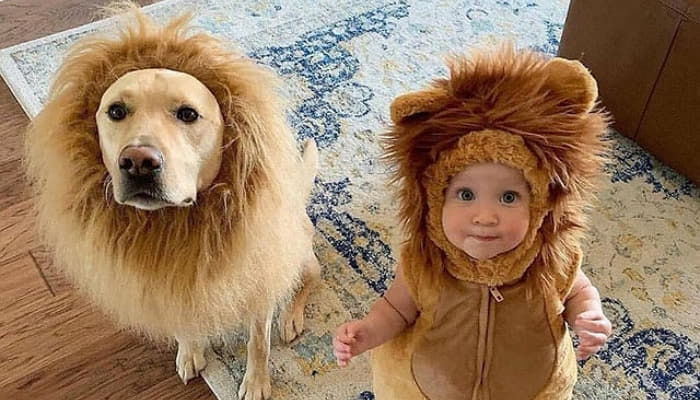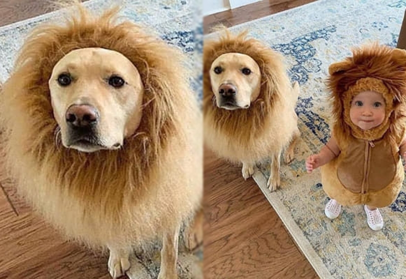 공개된 사진속에 등장하는 아기 집사와 강아지는 사자 코스프레라도 하듯 사자 갈기가 달린 옷을 입고 카메라를 향해 해맑은 표정을 짓고 있습니다.
