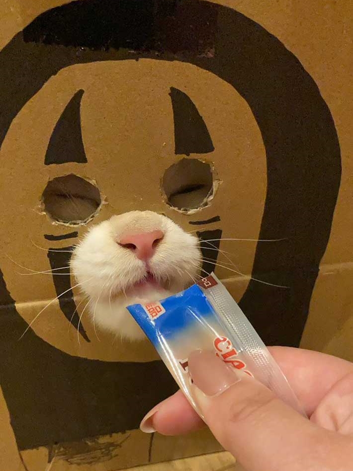 이후 네티즌은 박스 구멍을 통해 간식을 먹는 고양이의 모습을 보고 박스에 작은 그림을 함께 그렸죠. 그런데 그 모습이 마치 유명한 애니메이션인 '센과 치히로의 행방불명'에 등장하는 가오나시의 모습과 닮아 보이기 시작하면서 많은 네티즌들은 귀엽다는 반응과 함께 즐겁다는 반응을 보였습니다.