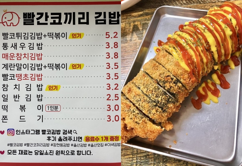 울산 장현동 아파트 단지 내 상가에 있는 '빨간 코끼리 김밥'은 빨코 김밥으로 잘 알려진 곳으로 이색적인 김밥과 분식을 먹을 수 있는 곳입니다. 두툼하면서도 바삭함이 살아 있는 튀김옷에 매콤한 맛이 매력적인 '빨코 튀김 김밥'과 달걀지단 외에도 계란물을 김밥 겉면에 입혀 한 번 더 익힌 담백한 계란말이 김밥이 시그니처 메뉴입니다. 대표 메뉴 가격은 빨코 튀김 김밥(매운맛)+떡볶이 5,600원입니다.