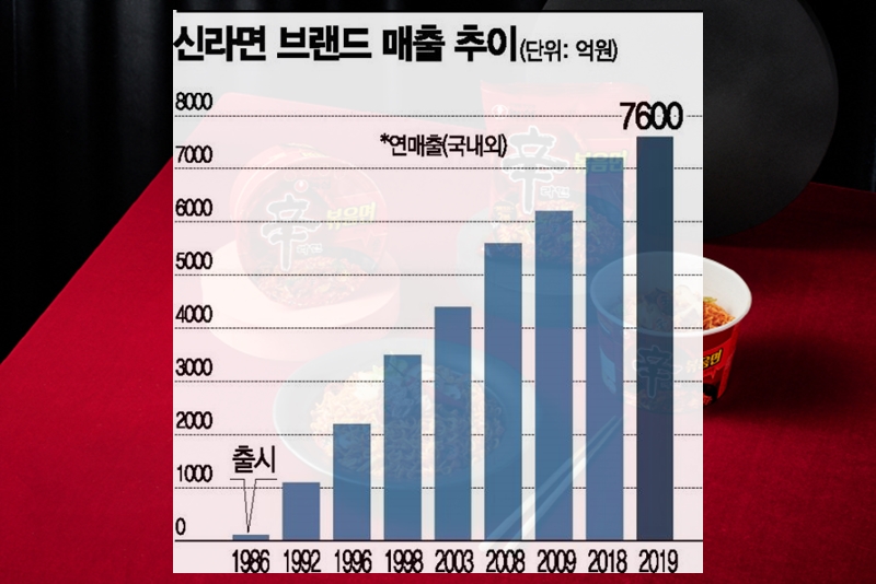 신라면은 '매울 신(辛)'자의 '맵다'는 뜻과 당시 농심 신춘호 회장의 성을 동시에 의미하는 '신(辛)'을 앞세워 농심 연구개발팀에서 전통 한국 요리의 하나인 소고기장국에서 아이디어를 얻어 출시 당시만 해도 매운 라면은 안된다는 일종의 고정관념이 있던 라면 시장의 틈새를 공략해 출시 다음 해인 1987년 46.3%의 점유율을 시작으로 1988년 처음으로 50%을 넘었죠. 이후 다변화된 인스턴트 시장의 변화와 다양한 제품 등의 출시로 한때 인스턴트 라면 시장 점유율 20% 미만으로 떨어지기도 했지만 2020년부터 다시 라면 시장 1위를 유지하고 있습니다.