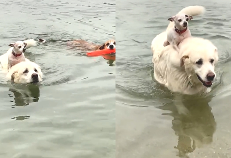 공개된 영상 속에 등장하는 작은 강아지는 한두 번이 아니라는 듯 너무나도 익숙하게 자신보다 몇 배나 큰 강아지의 등에 올라타 자리를 잡고 있습니다. 덩치가 큰 강아지 역시 귀찮을 듯한데 전혀 내색 없이 등에 강아지 친구를 태워 물속으로 들어가고 있죠.
