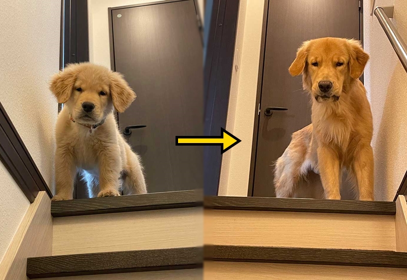 하지만 불과 6개월 만에 인절미였던 댕댕이는 몰라보게 자랐다고 하는데요. 현재의 몸무게는 무려 29kg에 달할 정도로 거대한 골든 리트리버의 위엄을 자랑하고 있다고 합니다. 이에 6개월 전과 현재의 모습을 정확히 비교하기 위해서 똑같은 장소에서 찍은 사진을 SNS 계정을 통해 공유하게 되었죠.