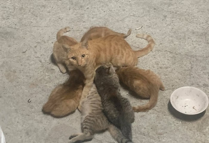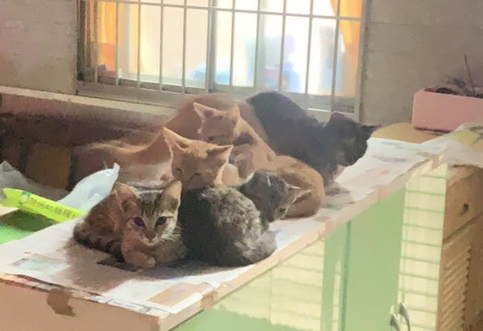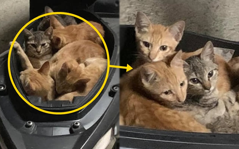 그런데 이 남성은 열려 있는 오토바이 트렁크에 무엇인가 움직이는 물체를 발견하게 되었죠. 이에 자세히가서 살펴본 남성은 움직이던 물체가 고양이라는 사실을 알게 되었습니다. 그것도 한 마리도 아닌 새끼 고양이 6마리와 어미 고양이 1마리로 총 7마리의 길고양이 가족이었습니다.