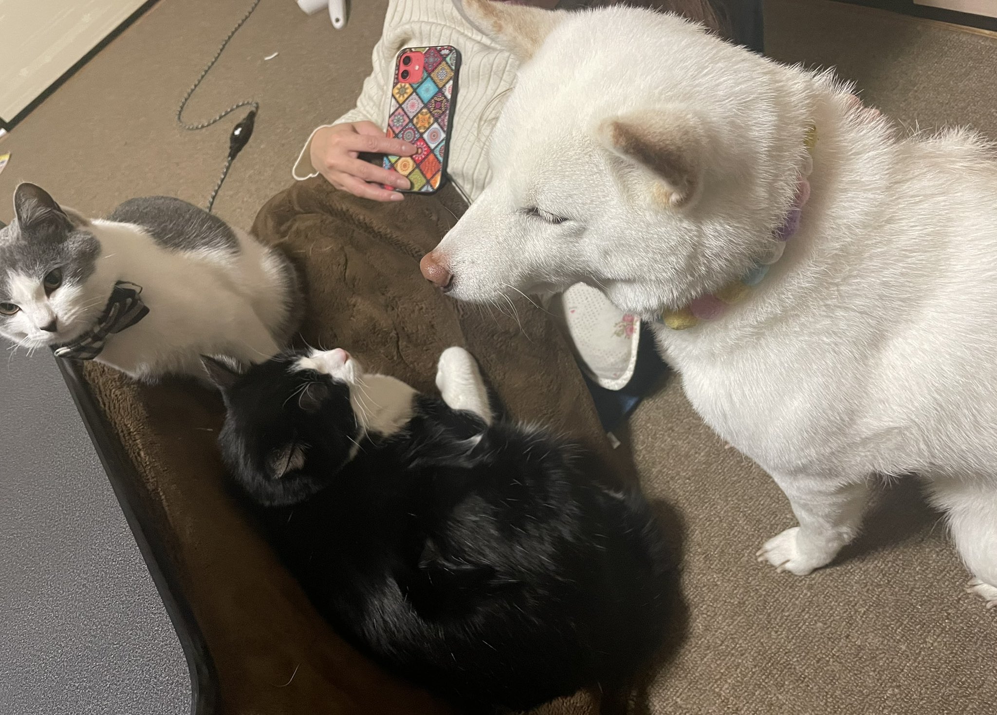 평소에도 사이가 좋다는 고양이 2마리와 강아지 1마리 가족..어떠세요? 보기 정말 좋지 않으신가요? 아마도 이런 장면을 실제로 목격을 한다면 하루의 피로가 싸악 풀릴 만큼 웃음이 나올 거 같은데요. 반려동물을 키운다는 건 이렇게 즐거움을 얻을 수 있는 것 때문은 아닐까요?(*출처:@__RENKO__twitter_)