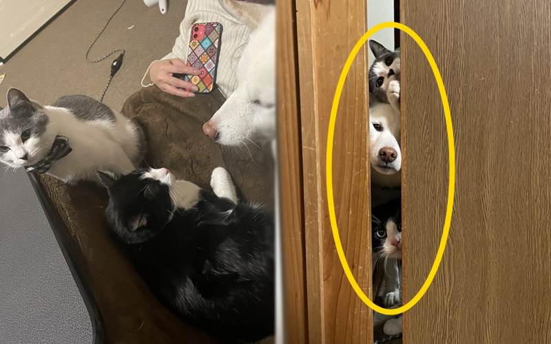 어느 날 네티즌은 저녁을 준비하기 위해 분주하고 움직이고 있었다고 합니다. 그러다 어디선가 문뜩 조용함을 느끼고는 등 뒤를 돌아봤다고 하는데요. 등 뒤에는 네티즌이 키우고 있던 고양이 2마리와 댕댕이가 문 뜸 사이로 네티즌이 무엇을 하는지 구경을 하고 있었다고 합니다.
