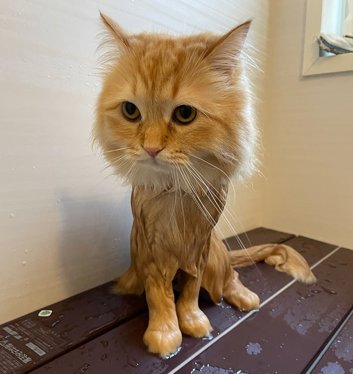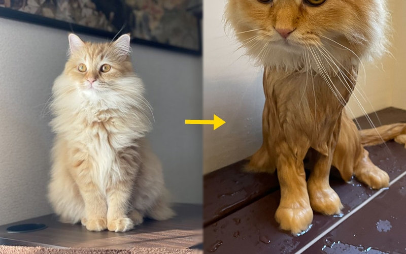 네티즌이 공개한 사진속에 등장하는 고양이는 풍성한 털들이 물에 젖어 가느다란 보디라인이 그대로 노출되고 있는 사진으로, 평소에는 엠마라는 이름의 고양이는 긴 털들로 온몸을 아름답게 감싸고 있었다고 하죠.