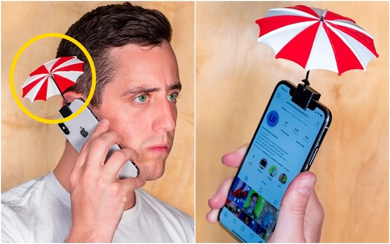 미니 우산으로 보이는 이 구성품은 비 오는 날에도 스마트폰이 젖지 않게 사용할 수 있는 디자인으로 실제로는 판매되고 있는 제품은 아닙니다. 하지만 한 디자이너가 이런 제품도 있으면 좋겠다는 생각으로 디자인을 했다고 하는데요. 그 디자이너의 이름은 '맷 베네데토(Matt Benedetto)'로 실제로 사용되는 제품 디자인이 아닌 사람들에게 재미를 주기 위한 엉뚱한 디자인 제품을 만들기로 유명하죠.