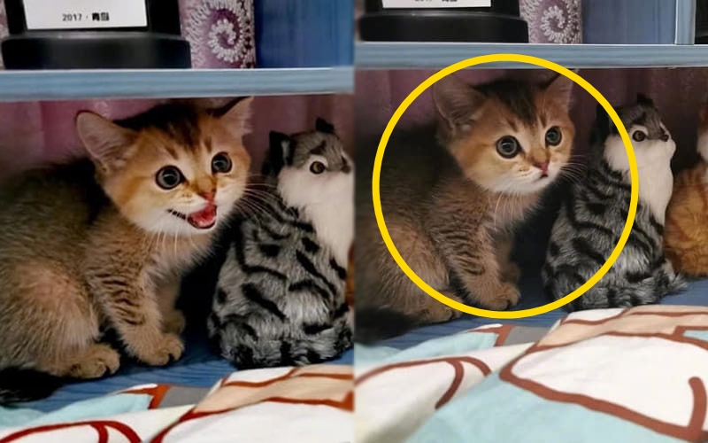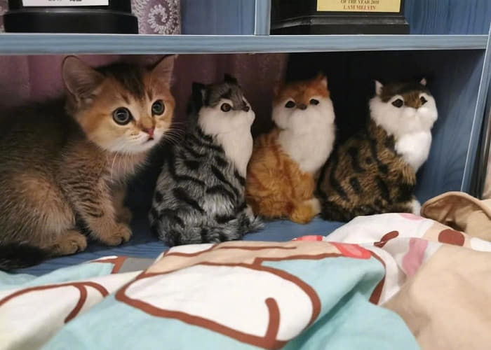 또 다른 사진속에는 고개를 갸우뚱하며 마치 '응? 나를 외 못 찾지?'라는 듯 의아해하는 표정이 사진이 담겨 있습니다. 사진을 보면 어떻게 이렇게 고양이 인형들과 잘 어울리는지 그저 신기하다는 생각이 드는데요.