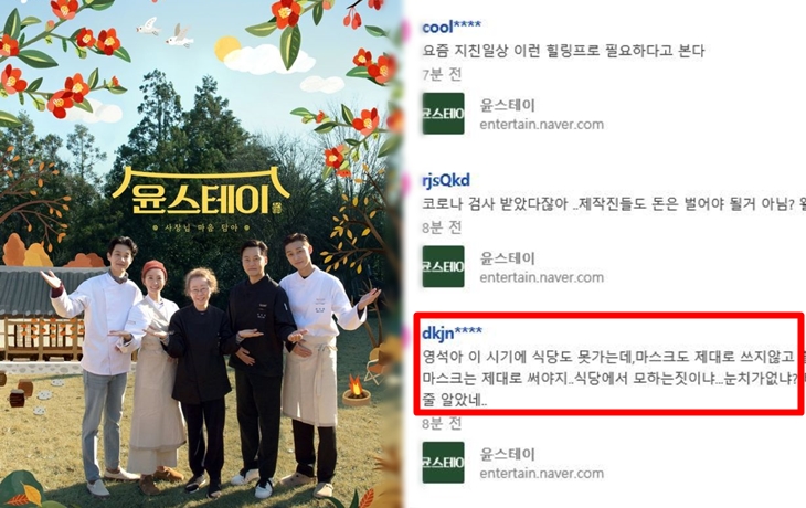 일부 네티즌들은 첫 방송 직후 시청자 게시판 등을 통해 "이 시국에 무슨 여행,민박을 장려하는 프로그램이냐?" "아무리 예능이라도 식당에서 뭐 하는 짓이냐?" "12월이면 코로나 2~2.5계가 한창일 때인데 무리해서 진행하는게 보기 좋지 않다."등 부정적인 의견을 보이고 있다고 하는데요.