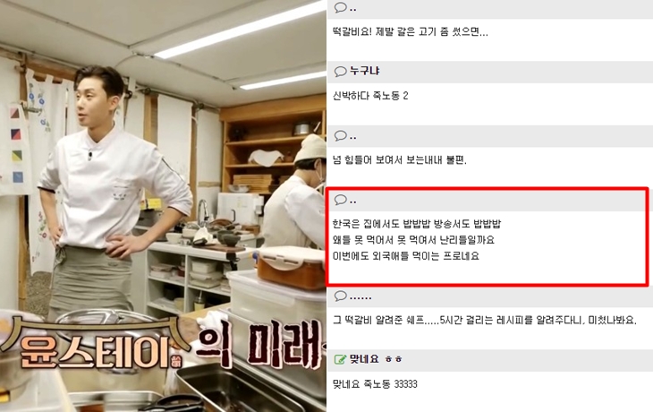 그 결과, 첫회 방송분부터 시청률 8.2%라는 초대박을 터트렸다고 하는데요. 하지만 코로나19와는 전혀 다르게 엉뚱한 곳에서 논란이 터지기 시작했다고 합니다. 일부 커뮤니티 사이트에서 시작된 논란은 윤스테이에 출연하고 있는 출연진들의 노동강도와 밥과 관련이 되었다고 합니다.