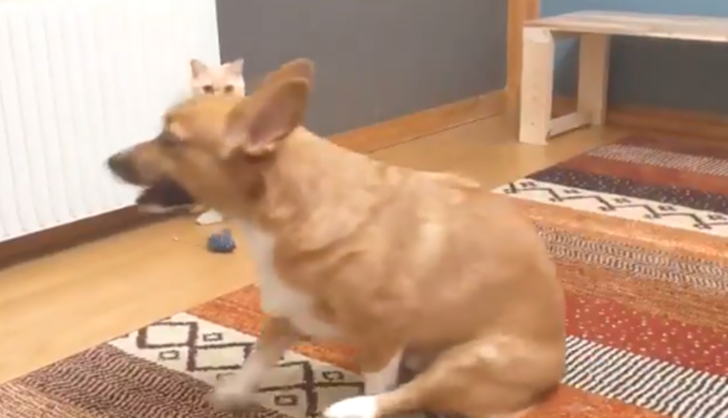 어떠세요? 마치 고양이에게 관심을 두고 있는 보호자로 인해 고양이를 질투하는 듯한 행동을 하는 웰시코기의 모습, 보고만 있어도 힐링이 되는듯 합니다.