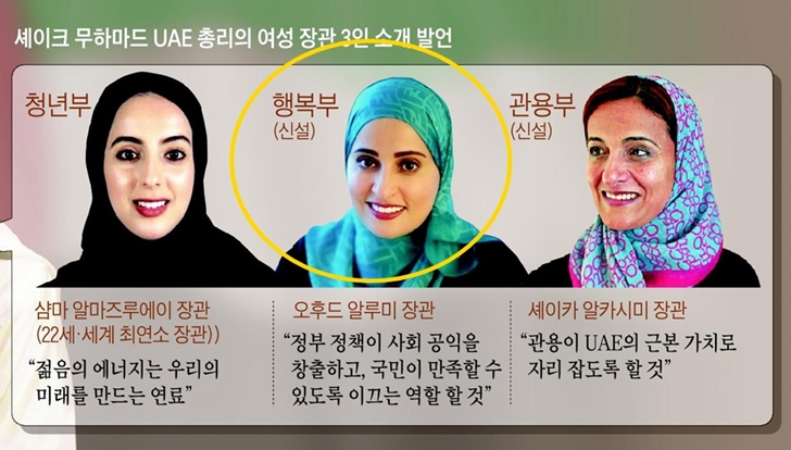 아랍 에미리트 연합(UAE)에는 두바이를 포함해 주민들의 행복을 담당하는 장관이 별도로 존재를 한다고 합니다. 행복을 장관 하는 장관의 역할은 두바이의 모든 주민들이 행복할 수 있도록 정책들을 만드는 역할을 한다고 합니다.