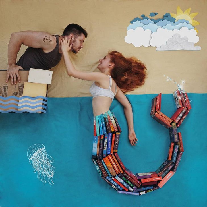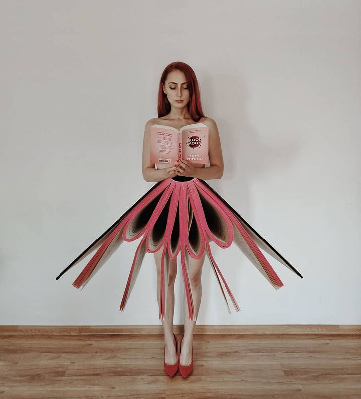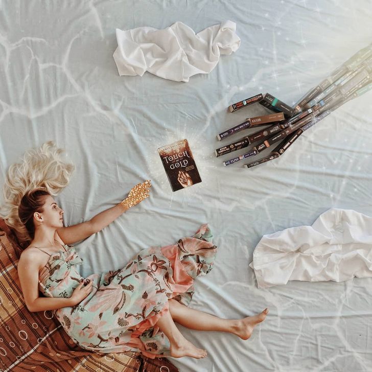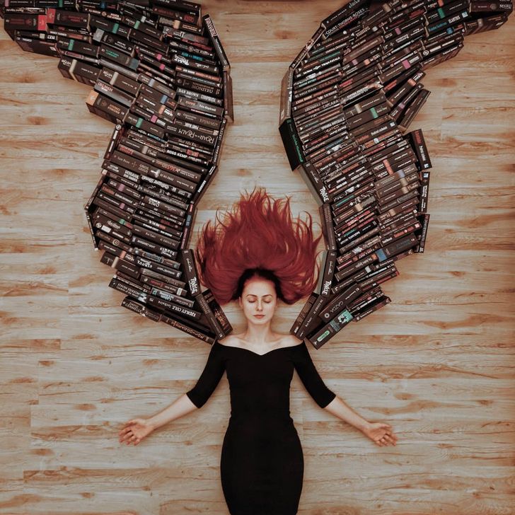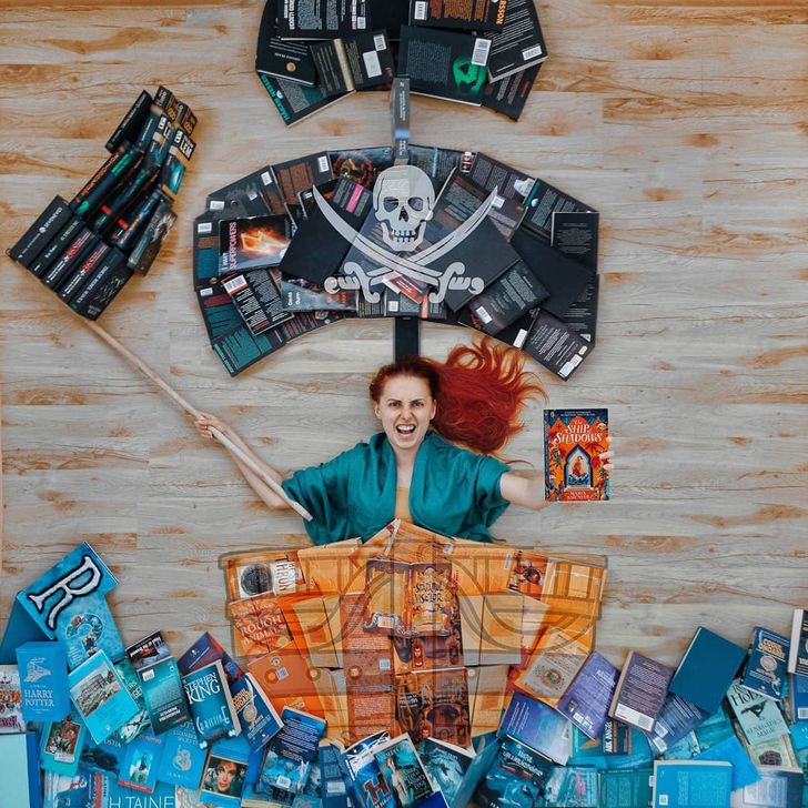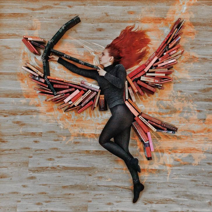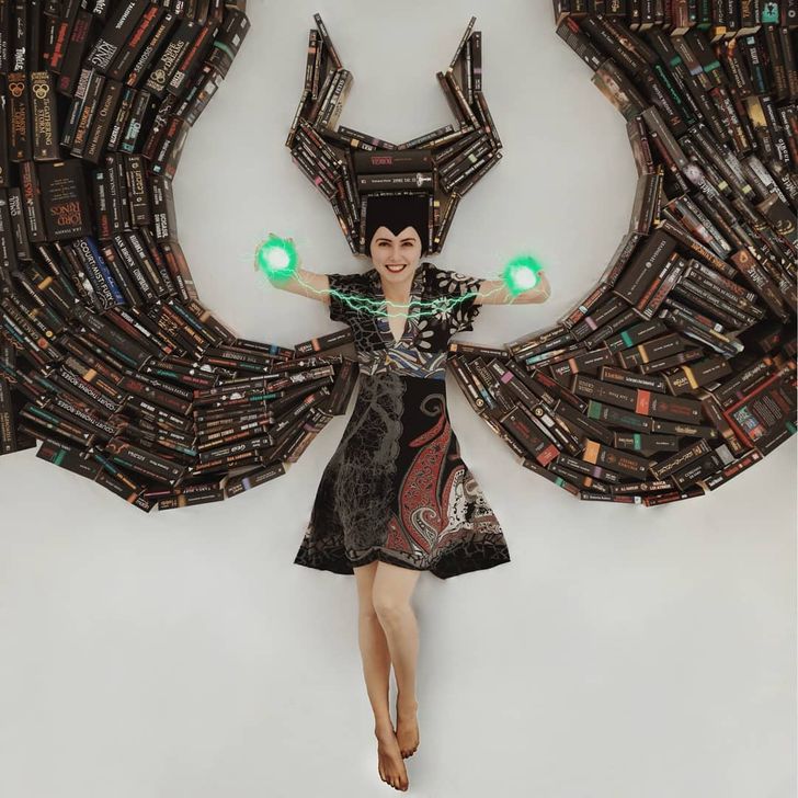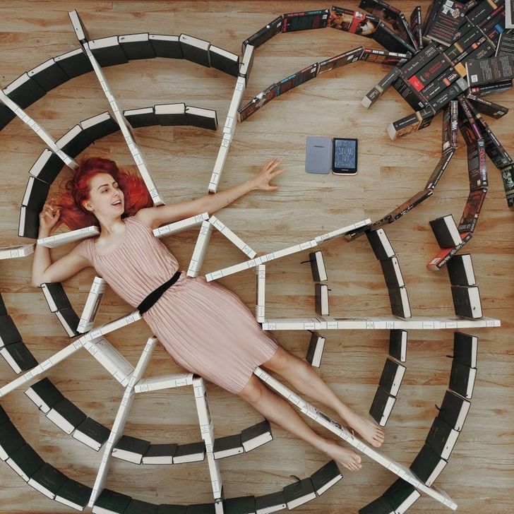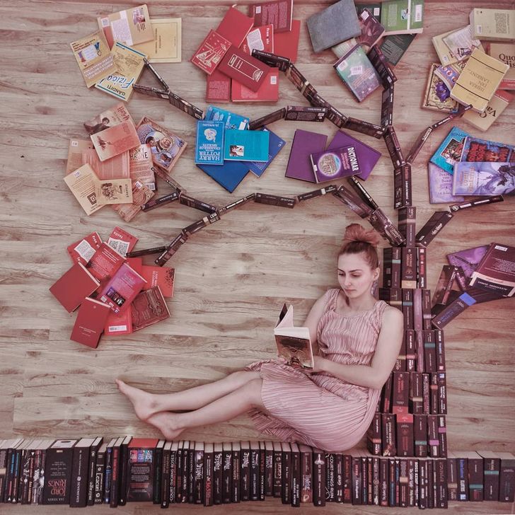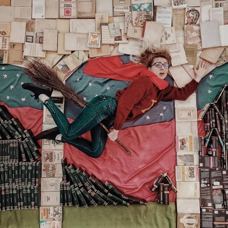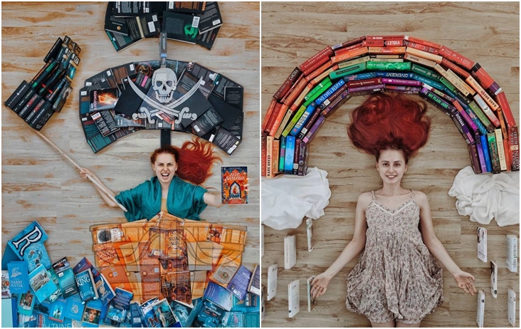 그녀는 책 표지의 색상과 디자인이 모두 다르다는데에서 아이디어를 얻어 바닥에 누워 책을 펴기도 하고 세우기도 하면서 독특한 배경을 만들어 마치 자신이 주인공이 된듯한 착각을 주는 사진들을 찍기 시작했다고 합니다.