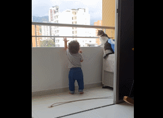 베란다에서 아이의 행동을 막고 있는 고양이의 모습, 기특하면서도 정말 영특하다는 생각이 드는데요. 고양이는 아이의 행동이 위험하다는 걸 인지하고 막고 있는 건지 정말 궁금해집니다.