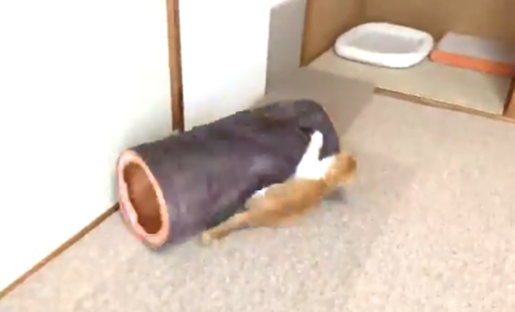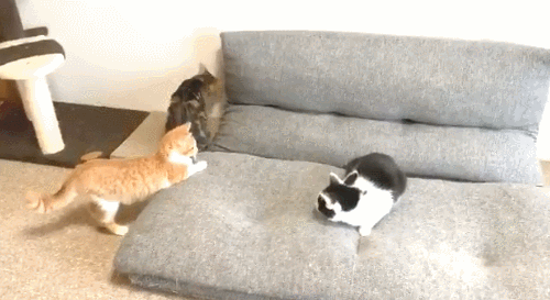 일본에서 여러 마리의 고양이를 키우고 있는 네티즌은 방 안에서 들떠 있던 고양이가 다른 고양이에게 장난을 치는 과정에서 발생된 재미있는 상황이라며 자신의 SNS 계정(@uni_mugi_hachi/twitter)을 통해 사연을 공유했다고 합니다.