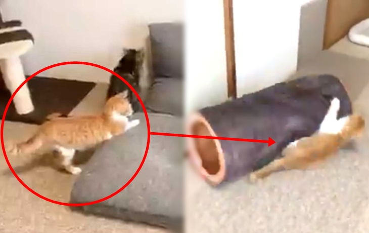 네티즌이 공유한 동영상속에는 다른 고양이들에게 장난을 치는 한 마리의 고양이가 등장을 합니다. 그리고 이내 방안을 이리저리 돌아다니다 통나무처럼 보이는 쿠션을 발견하고 통나무 위로 점프를 하지만 쿠션으로 인해 그만 미끄러워 버렸다고 합니다. 그런데 웃긴 건 바로 고양이의 포즈였다고 합니다. 다른 고양이들에게 쪽팔린 상황이었는지 한동안 시체처럼 끔 적도 하지 않았다고 합니다.