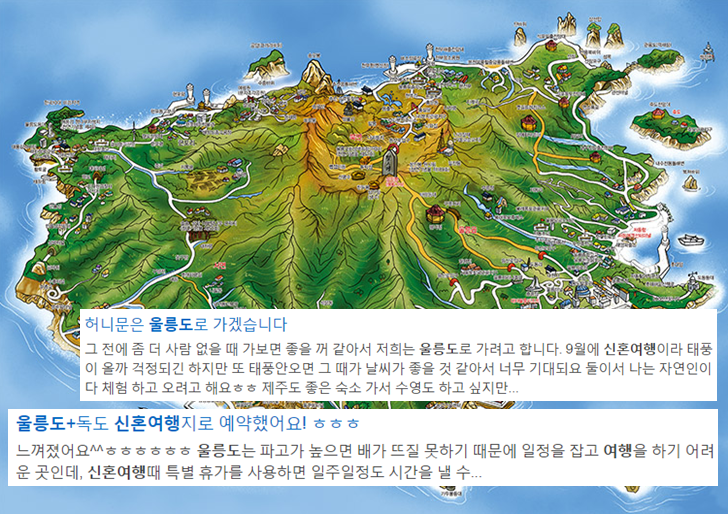실제로 한 사연자는 제주도로 신혼여행을 가려고 했던 계획을 모두 취소하고 울릉도로 신혼여행을 알아보게 되었다며, 제주도를 취소한 가장 큰 이유는 언제든지 갈 수 있는 제주도에 비해 울릉도와 독도는 가보고는 싶지만 직장 생활을 하면서 생각만큼 시간을 내기 어렵다는 점이었다고 합니다. 실제로 제주도의 경우에는 비행기를 통해 한 시간 이내면 도착할 수 있어 언제든지 어렵지 않게 여행을 할 수 있지만 울릉도의 경우에는 강릉, 포항, 울진, 후포, 동해 등으로 일단 이동을 한 뒤 배를 타야 한다는 번거로움이 있습니다.