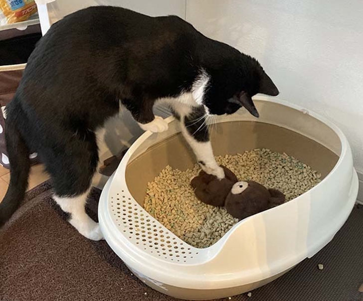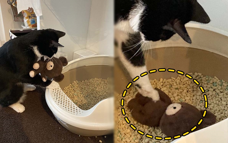 실제로 해당 네티즌이 공유한 사진 속에는 "화장실은 여기야"라고 말하면서 고양이 전용 화장실에 곰인형을 살포시 두고 있는 고양이의 모습이 담겨 있다고 합니다.