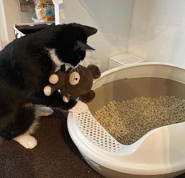 어느 날 네티즌은 자신의 고양이가 매우 아끼는 곰인형을 들고 와 화장실에 두는 모습을 발견했다고 합니다. 이에 그 모습이 흡사 곰인형에게 화장실의 위치를 알려주는 듯한 느낌을 받았다고 하는데요.