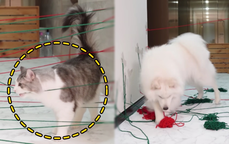 고양이와 다르게 개는 모든 실을 엉망진창으로 만들고 그대로 돌진을 했다고 하는데요. 공유된 영상속에는 고양이와 개의 모습이 너무나도 대조를 이루며 담겨 있다고 합니다.