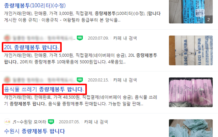 사용하던 종량제 봉투의 경우 이사를 가게 될 경우 다른 지역에서는 사용을 하지 못하게 되다보니 가끔 종량제 쓰레기봉투를 중고마켓을 통해 판매하는 경우들이 있습니다. 하지만 종량제 봉투의 경우에는 온라인으로 판매하는 행위는 불법이며, 폐기물 관리법에 의거해 지방자치단체와 판매 대행 계약을 한 사람만 종량제 봉투를 판매할 수 있다고 합니다. 만약 개인이 허가 없이 온라인으로 판매하게 될 경우에는 300만 원 이하의 과태료가 부과될 수 있다고 합니다.