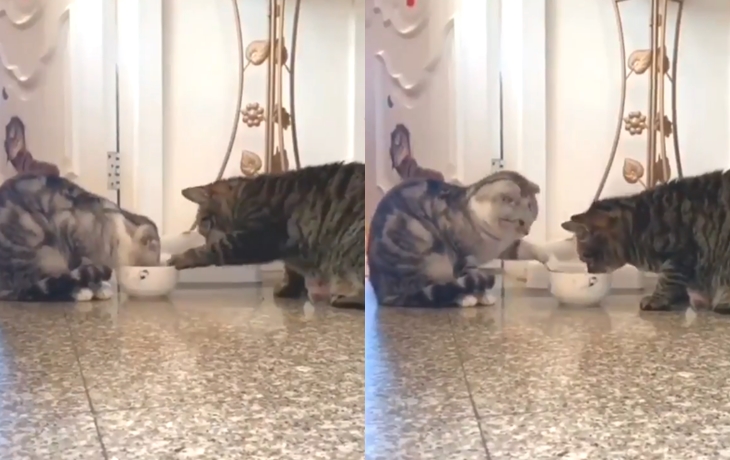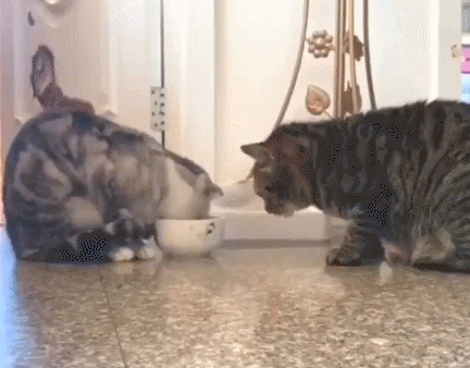 과연 서로 적당량만큼 먹은 뒤 앞에 있는 고양이에게 먹이를 양보하고 있는 동영상의 정체는 무엇일까요? 어떻게 밥그릇을 서로에게 양보할 수 있는지 전혀 이해가 되지 않습니다.