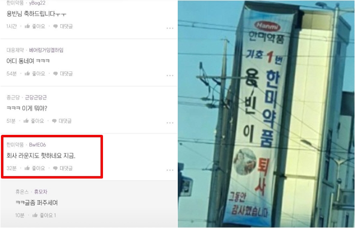비트코인으로 대박을 친 한 남성이 회사를 퇴사 사면서 걸었다는 대형 현수막의 사진이 인터넷에 퍼지면서 각종 커뮤니티 사이트에서는 다양한 추측과 함께 <비트코인으로 50억을 벌었다. 그래서 퇴사를 했다.>라는 말과 함께 현수막 게시자가 가상화폐인 비트코인으로 50억 원을 번 뒤 퇴사를 하면서 15년 동안 재직한 한미약품에 감사하는 마음을 전하기 위해 현수막을 제작했다고 합니다. 이에 네티즌들은 "정말 부럽다." "50억이면 평생 이제 편히 먹고살겠구나." "나도 퇴사할 때 저렇게 한번 해보고 싶다."등 다양한 반응들을 보였다고 합니다.