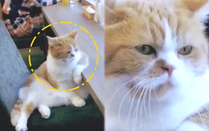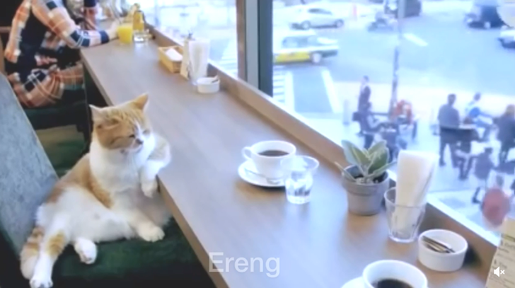동영상속에 등장하는 고양이는 카페 창가 자리에 마치 사람처럼 팔을 테이블에 올리고 커피 한잔을 주문 후 여유롭게 창밖을 바라보고 있는 모습 입니다.