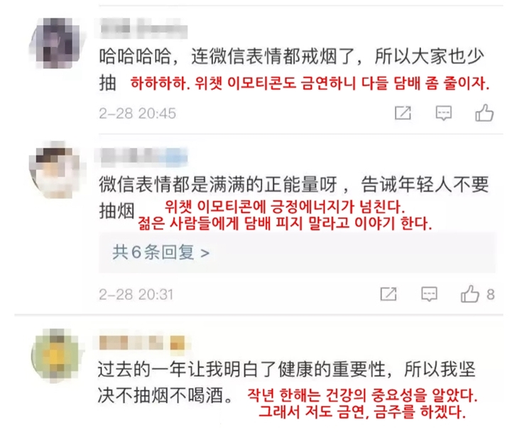 그리고 마지막으로 2021년 10년간 담배를 핀 위챗의 이모티콘 역시 금연을 선언하게 되었다고 하는데요. 이를 본 많은 한국의 네티즌들은 "저런건 배워야 하는 거 아닌가?" "한국의 메신저나 SNS 서비스들도 금연을 선언해야 할 거 같은데?" "이모티콘도 금연을 하는 판에 나도 올해는 금연을 해야겠다." "카 X에도 담배 관련 이모티콘을 삭제해주세요"등 다양한 반응들을 보이고 있다고 합니다.