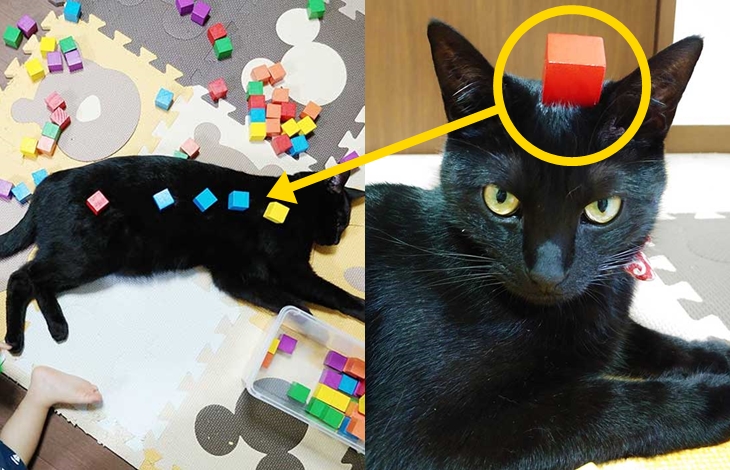 네티즌의 어린 아들은 고양의 몸에 블럭을 올려놓기 시작하며 결국 나중에는 머리 위에도 블록을 쌓기 시작했다고 합니다. 하지만 놀랍게도 어린 집사가 그렇게 자신의 몸에 블록을 쌓고 있음에도 불구하고 고양이는 전혀 미동도 하지 않았다고 하는데요. 오히려 그렇게 노는 거 좋다는 표정까지 지었다고 합니다.