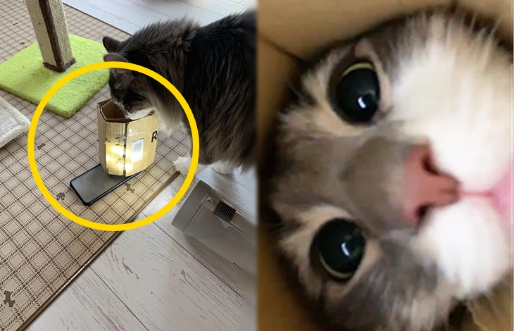일단 이 방법을 공유한 네티즌은 촬영을 위해 스마트폰을 소독했다고 합니다. 그리고 고양이가 스마트폰의 렌즈를 들여다 보듯 촬영을 하기 위해 박스를 원통형으로 말았다고 하는데요. 그렇게 원통형으로 만든 박스를 스마트폰의 렌즈에 떨어지지 않게 부착한 다음 원통 주변으로 고양이가 좋아하는 간식을 뿌려두었다고 합니다. 또 조금 더 다른 사진을 원하시는 분들이라면 스마트폰에 장착된 조명을 활용하게 될 경우에는 조명 빚으로 인해 고양이의 동공이 좁아져 또 다른 느낌의 사진을 얻을 수 있다고 합니다.