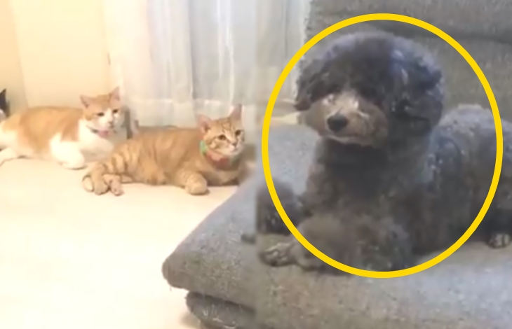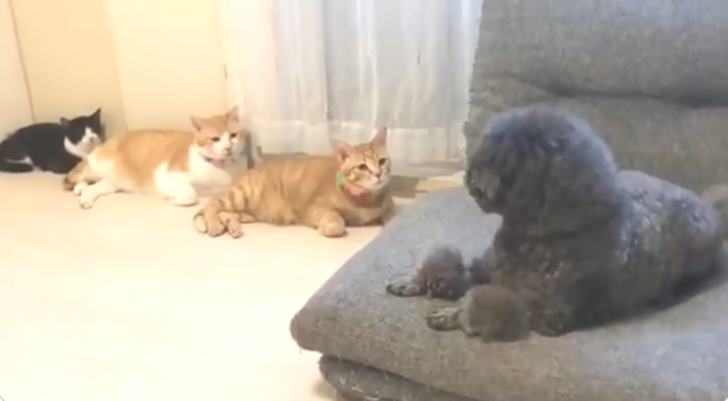 네티즌이 공유한 동영상에는 소파에 앉아 있는 강아지를 바라보고 있는 3마리의 고양이들을 볼 수 있습니다. 고양이들은 미동도 하지 않고 강아지를 경계하는듯한 시선으로 바라보고 있습니다. 이어 무엇인가 이상함을 느낀 강아지는 뒤를 돌아본 순간 자신을 향해 있는 고양이들의 시선을 발견하고 무엇인가 잘못되었음을 느꼈는지 계속 뒤를 돌아보고 있습니다.