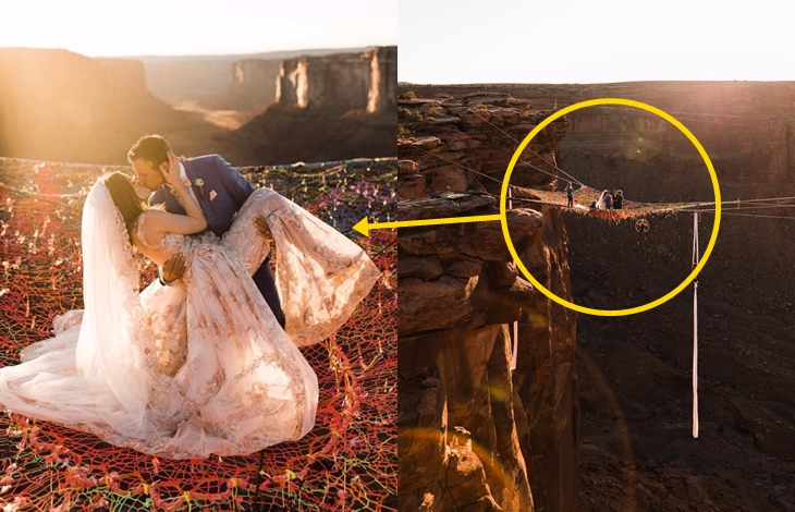 그리고 그들은 40층 건물 높이에 그물을 설치하고 무려 120m 상공에서 실제로 결혼식을 올렸다고 합니다. 안전상에 이유로 비록 하객들은 그물이 설치된 협곡에서 축하를 해주긴 했지만 그래도 그물 위에는 결혼식을 위한 주례 및 신랑, 신부 들러리까지 함께 있을 건 다 있었다고 하는데요. 취미를 통해 만나 그 취미를 결혼식까지 활용한 용감한 커플 과연 그들의 결혼식은 어떠한 모습이었을까요?