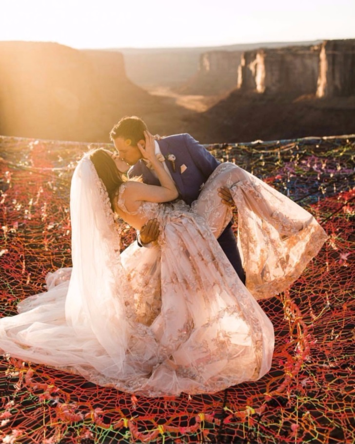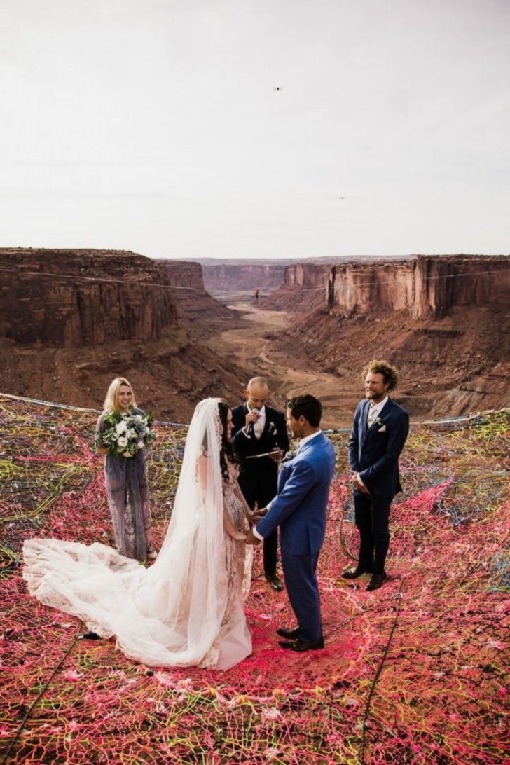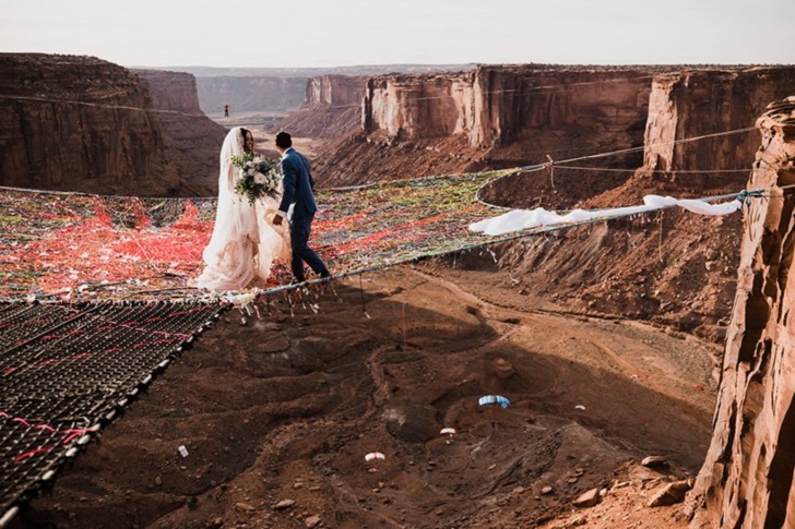 미국 유타주에 있는 '모압 캐니언' 협곡은 익사이팅을 즐기는 사람들에게는 매우 도전적인 곳이라고 합니다. 이 곳은 매년 슬랙 라이닝(협곡에 줄을 연결해 그 위를 걷는 레저 활동)을 즐기는 사람들이 모여 축제를 여는 곳이기도 하죠. Ryan Jenks와 Kimberly Weglin 역시 이 축제를 통해 만난 커플로 다른 사람들과 똑같은 평범한 결혼식을 올리기보다는 자신들을 연결시켜준 슬랙 라 니닝을 활용해 결혼식을 올리기로 결정했다고 합니다.