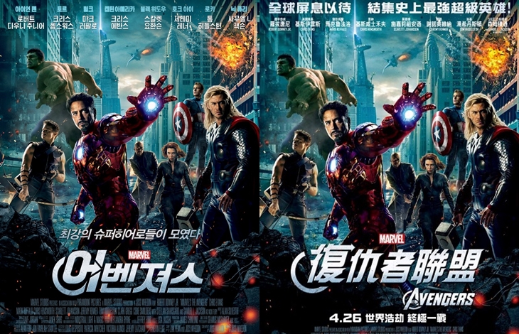 '어벤지(Avenge)'가 복수하다는 뜻에서 중국에서는 복수를 하는 사람들의 모임이라는 뜻을 갖고 있는 '복수자 연맹(复仇者联盟)'이라는 제목으로 개봉이 되었다고 합니다. 재미있는 사실은 영화에 등장하는 캐릭터의 경우 캡틴 아메리카는 미국 대장, 토르는 뇌신, 헐크는 녹거인, 블랙위도우는 흑과부로 번역이 되었다는 사실입니다.
