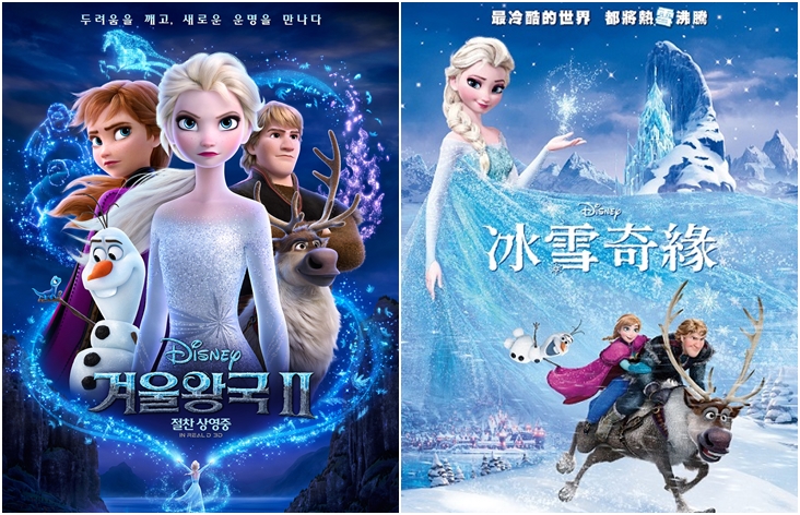 한국에서는 '겨울왕국'으로 개봉된 'Frozen'의 경우 중국에서는 '빙설 대모험(冰雪大冒险) '으로 개봉이 되었다고 합니다. 신기한 점은 대만의 경우에는 '빙설 기연(冰雪奇缘)'이라는 제목으로 개봉이 되었으며 이는 눈과 얼음의 기이한 이야기라는 뜻이라고 합니다.