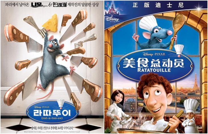 한국에서도 인기를 얻었던 라따뚜이의 경우 영화의 내용이 프랑스 최고의 요리사를 꿈꾸는 생쥐 레미의 이야기를 다룬다는 점에서 '미식 총동원(美食总动员)'이라는 제목이 붙여졌다고 합니다.