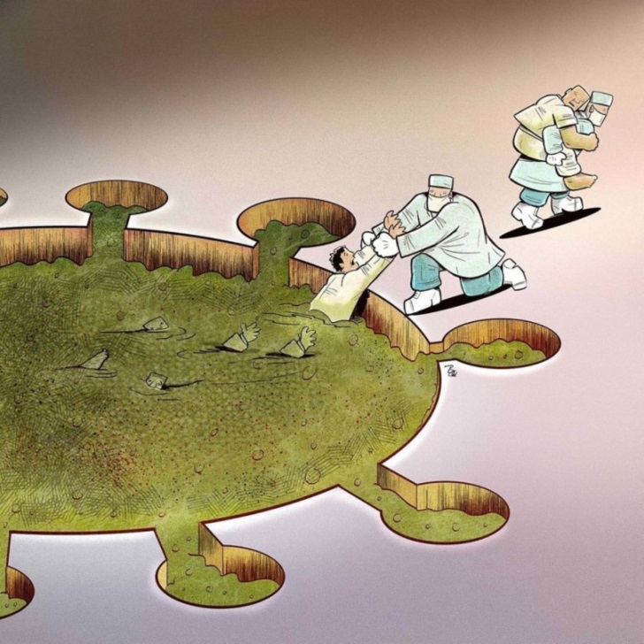 특히 이란의 만화가이면서 각종 일러스트레이터로 활동 중에 있는 '알리레자 팍델(alirezapakdel)'는 그림을 통해 의료진과 소방관들의 헌신과 희생정신을 표현하면서 많은 네티즌들 사이에서 화제가 되었다고 합니다. 그는 누구나 쉽게 그림을 통해 의료진들의 노고와 희생을 알도록 이번 작품을 그렸다고 하는데요. 열악한 환경 속에서도 묵묵히 환자 치료와 이송에 나선 코로나 19 최전선에 싸우고 있는 모든 사람들에게 감사의 뜻을 전했다는 의미로 그림을 그렸다고 합니다.