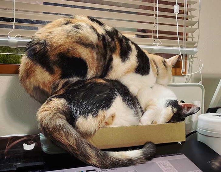 골판지 박스 쟁탈전에서 승리한 고양이는 골판지안에서 포근하게 앉아 휴식을 취하고 있으며, 쟁탈전에서 패배한 고양이는 어쩔 수 없이 골판지 박스에 앉아 있는 고양이 등에 올라타 휴식을 취하고 있는 모습이라고 합니다.
